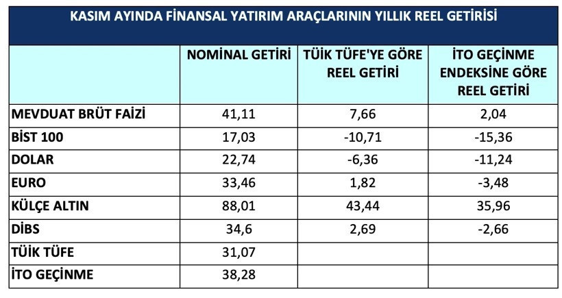 TÜİK’in verilerinin tartışmalı olduğunu belirten Korkmaz, “TÜİK kasım ayı itibariyle, finansal yatırım araçları nominal ve reel getiri oranlarını açıkladı. Ancak TÜİK verileri aşırı tartışıldığı için, TÜİK, TÜFE‘ye göre yayınlanan bu verileri ben İTO geçinme endeksine göre yeniden hesapladım. İTO geçinme endeksine göre Kasımdan- Kasıma son bir yılda Finansal yatırım araçları içinde en fazla reel getiriyi, yüzde 35,96 reel getiri olarak, altın sağladı. En yüksek reel kayıp ise, yüzde eksi 15,36 ile borsada meydana geldi” ifadelerini kullandı.