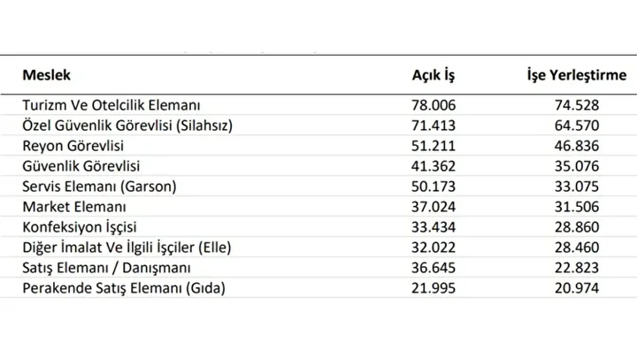 İşverenlerin en çok talep gösterdiği ancak eleman bulmakta zorlandığı meslek grupları da netleşti. Listenin zirvesinde turizm sektörü yer alırken, onu özel güvenlik ve market/perakende sektörü takip etti.